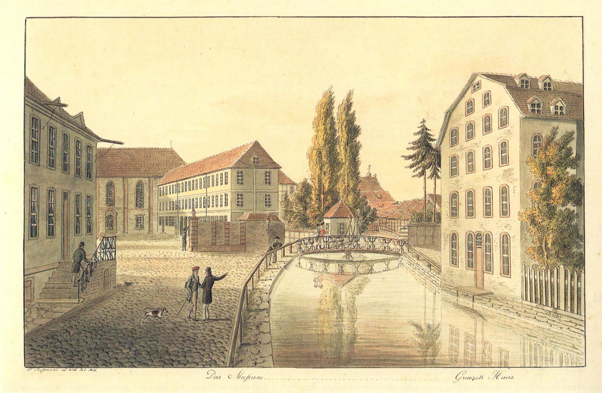 Gestern Nachmittag war schönes Wetter, wir machten einen Spaziergang nach Weende und waren recht angenehm und lustig; und doch konnte ich nicht so heiter sein wie die Andern, und wenn sie lachten und Schnocken erzählten oder sangen, so schweifte mein Blick nach dem fernen Süden hin und ich dachte, wie hinter den fernen Bergen die wohnt, die meine Seele liebt und wie Du vielleicht trauernd einsam sitzest u. auch meiner gedenkest u. als wir des Abends heimzogen u. der Mond am Himmel heraufstieg. So tröstete ich mich, wie er vielleicht auch Dir jetzt Trost und Frieden zulächle; u. Wehmuth wechselte mit Wonne in meinem Herzen, das Dir ein stilles Lebewohl auf frohes Wiedersehen zurief. Wie unser Collegium aussieht siehst Du vorn auf dem Bilde, wir haben aber keine Stunden darin, es dient nur für die mehr festlichen Anlässe, ich war erst 3 Mal darin. Glaube nicht jedoch, daß alle Häuser hier so schön seien; doch davon ein ander Mal. Während ich diese Zeilen schreibe sitze ich im Kabinettchen im Garten an dem kleinen Flusse der durch die Stadt fließt. Grieder sitzt am andern Ende des Tisches u. studiert.